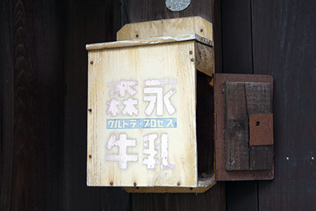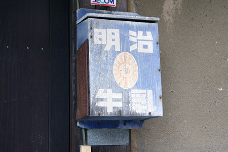 森永の牛乳箱。こちらも横蓋の部分に鍵穴が見えます。