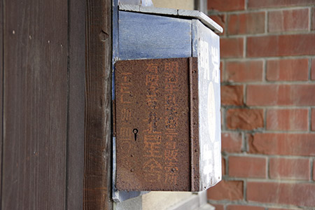 側面に金属製の蓋がかぶさっていて、鍵穴が見えます。鍵付きの牛乳箱は大変珍しいです。