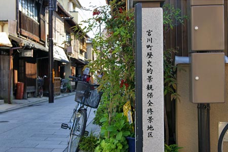 宮川筋三丁目から六丁目の市街地は、お茶屋が建ち並び江戸情緒ある通りで、京都市は平成11年に歴史的景観保全修景地区に指定しました。祇園甲部界隈に比べ、観光客は少なく静かに散策できる場所でもあります。*1
