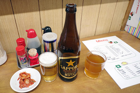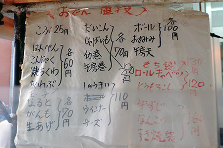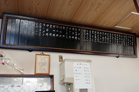 店内の壁面の「タンメン餃子3ヶ1,100円」の張り紙。雑誌の紙が使われています。