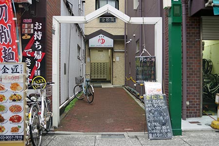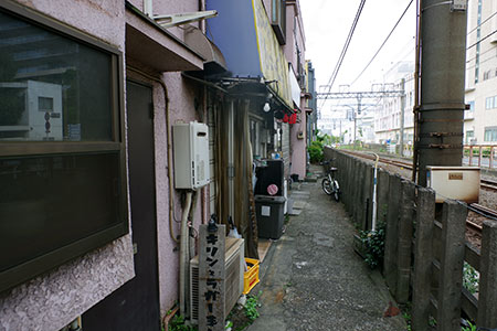 線路脇の幅の狭い通路が飲食ビルへの入口です。