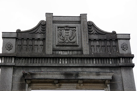 コリント・イオニア様式(古代ギリシアの建築様式)風の柱頭飾り(案内板より)。重厚な外観です。
