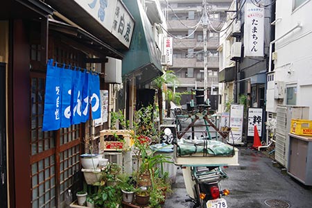 銭湯の若松湯※1 の南側に、この字型の小さな飲食街があります。