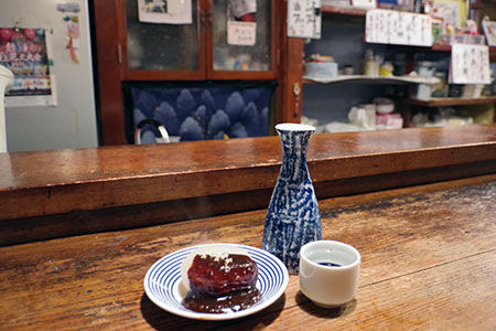 つるつるのカウンター席。魚偏湯呑(ぎょへんゆのみ)が似合います。