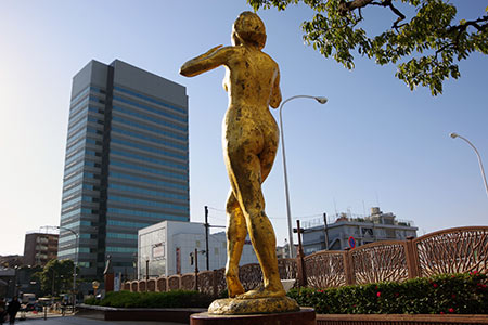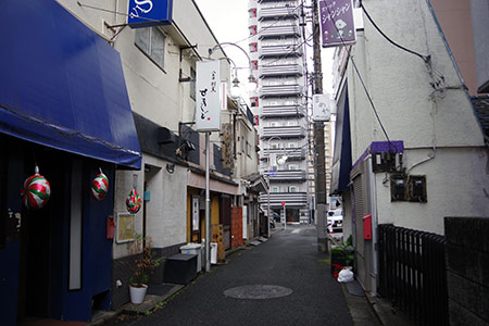薬王寺南側には、進駐軍の接待にも使われたと伝わる料理店・喜楽*1 に向かって、スナックやバーが入居する長屋型の店舗がありました。この喜楽と長屋に挟まれた東西に延びる小路は「出世街道」と通称され、一帯は毎夜多くの酔客で賑わう盛り場でした。*2