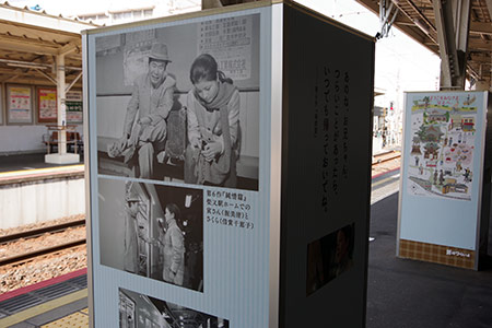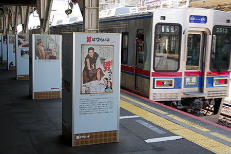 柴又駅のホーム柱四側面に、寅さんシリーズの映画のシーンが紹介されています。*1