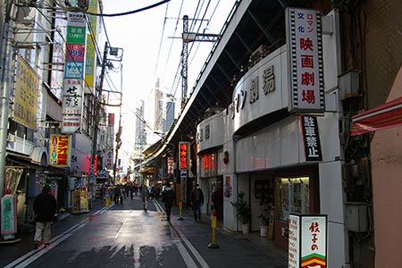 ビルの脇に橋のように見える遺構があります。水路がビルの下を流れていたのか、それとも、ここに何かの洗い場があって、それと道路を隔てるためのものでしょうか。