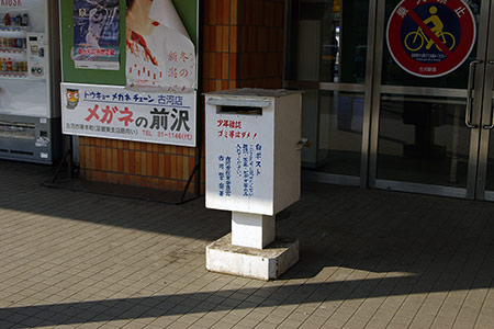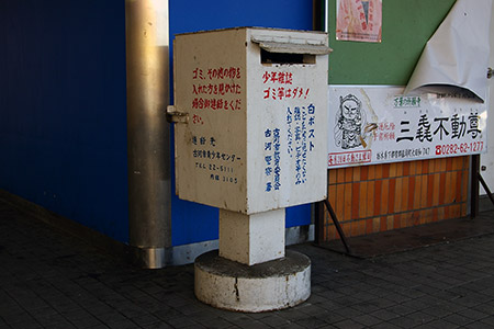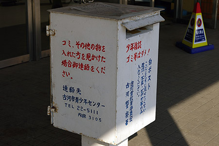 駅前に白ポストがあります。 「こどもたちに見せたくない雑誌・写真・ビデオ等のみ入れて下さい。」「少年雑誌、ゴミ等はだめ」と書かれています。