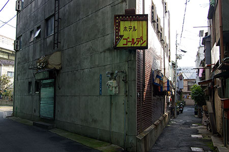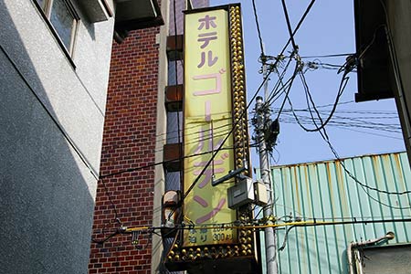 動物園前の駅から、商店街へ入ってすぐの路地裏に、「ゴールデン 休憩200より 宿泊300より」と書かれた看板があります。