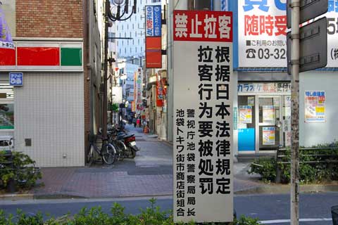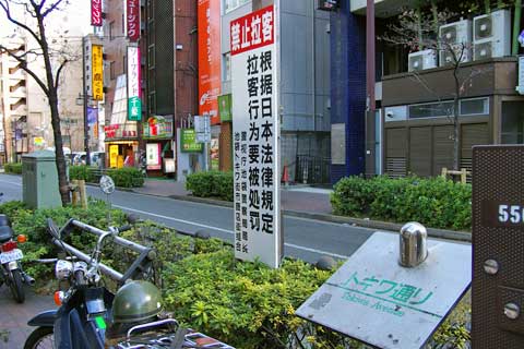 ソープランド街のあちこちに「客引き禁止」の看板があります。