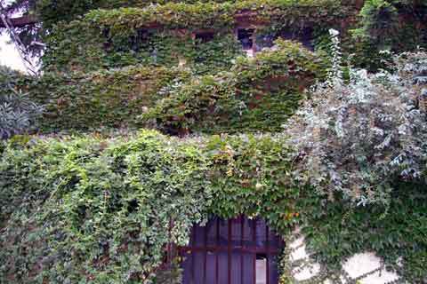 緑色の壁は路地の奥まで続いています。