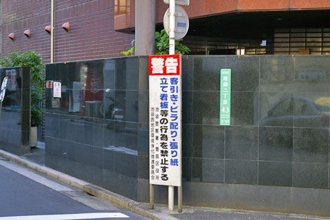 国道15号沿いの道路の歩道にも立て同じ立て看板があります。「暴力団追放!路上の客引きに注意」と書かれています。