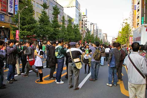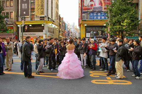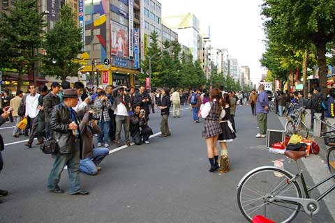 秋葉原の歩行者天国。メイド服を着た女の子がメイド喫茶のチラシを配っています。いつの間にか女の子を撮影する素人カメラマンが集まり、女の子も撮影に応じています。まるで撮影会場のようです。