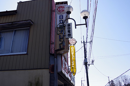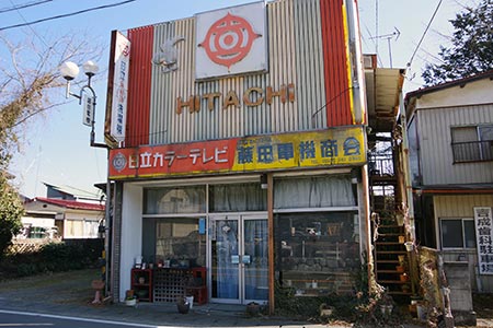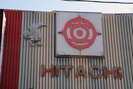 店の上部には、日立の亀の子マークとポンパくん。※1