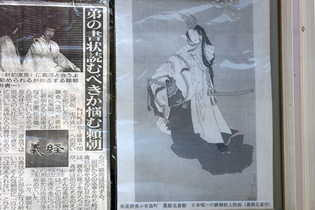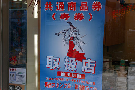 商店に貼られている商品券取扱店のポスターにも静御前の肖像が使われています。