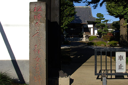 入口の石柱。「祖師聖人并靜女舊跡(祖師聖人并(ならびに)静女の旧跡)」と刻まれています。