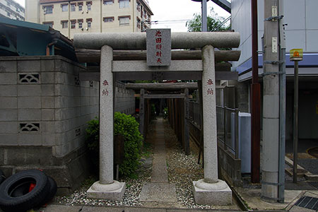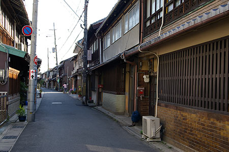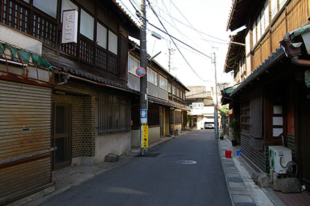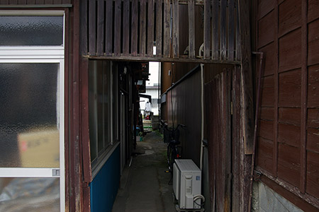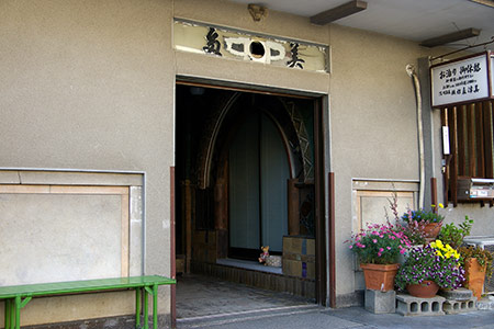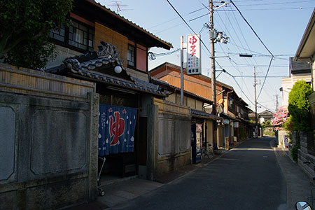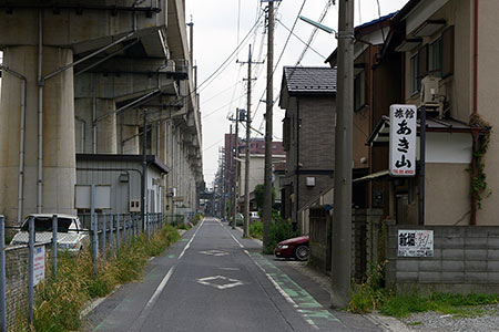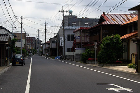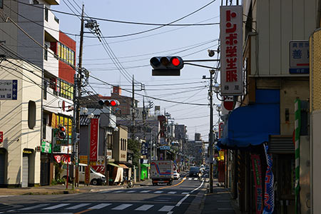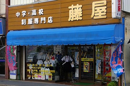 弁天通りと交差する銀座通り商店街。山梨英和学院(明治22年(1989年)の設立)専門の制服ショップがあります。
