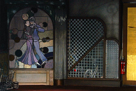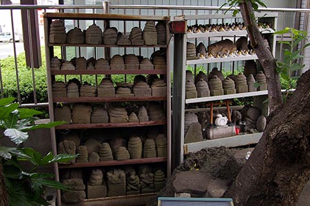 ビルの入口には、ナース服等のユニホームが展示されています。写真中央のナース服は、ピンク色で、襟が白。前チャックのデザインです。